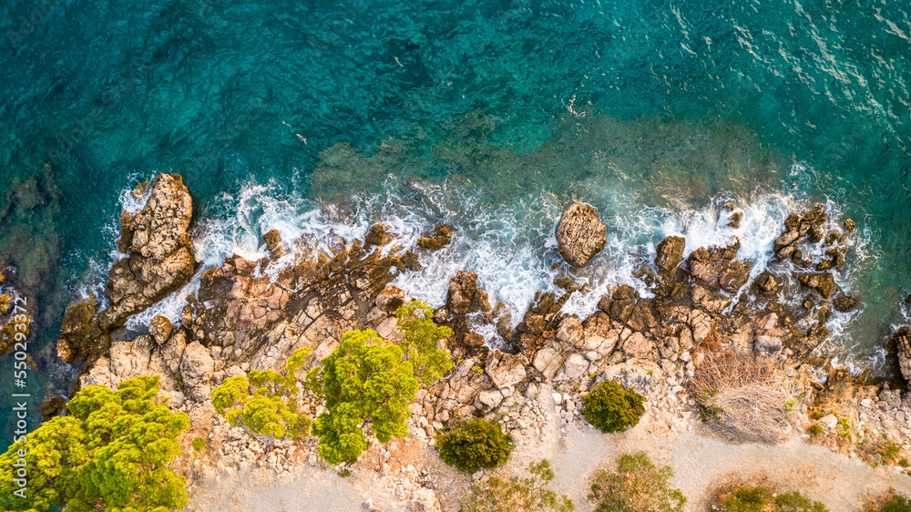 Beautiful azure blue Mediterranean beach surrounded by green trees in Croatia