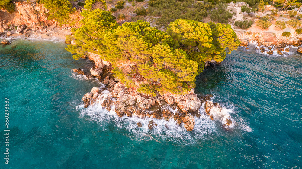 Beautiful azure blue Mediterranean beach surrounded by green trees in Croatia