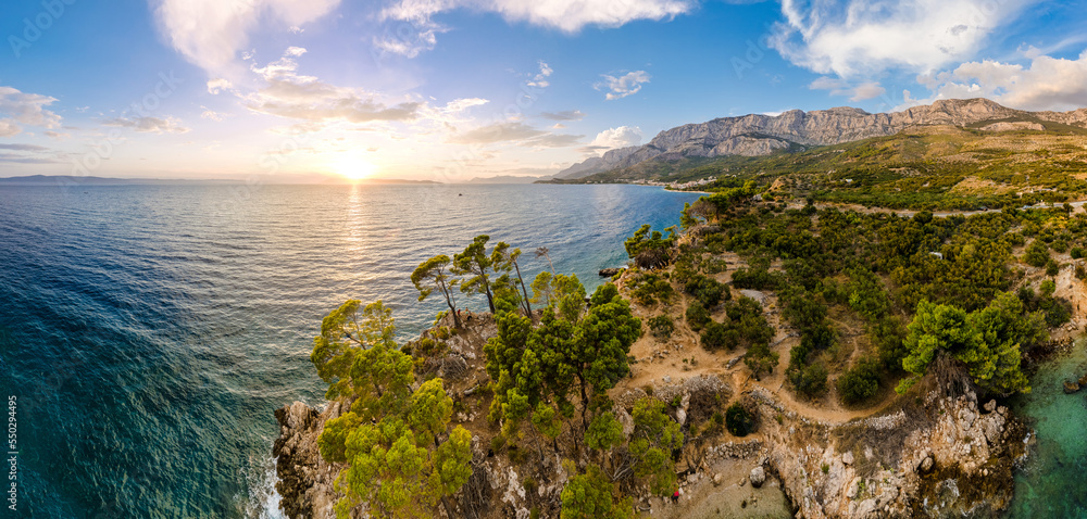 Beautiful azure blue Mediterranean beach surrounded by green trees in Croatia