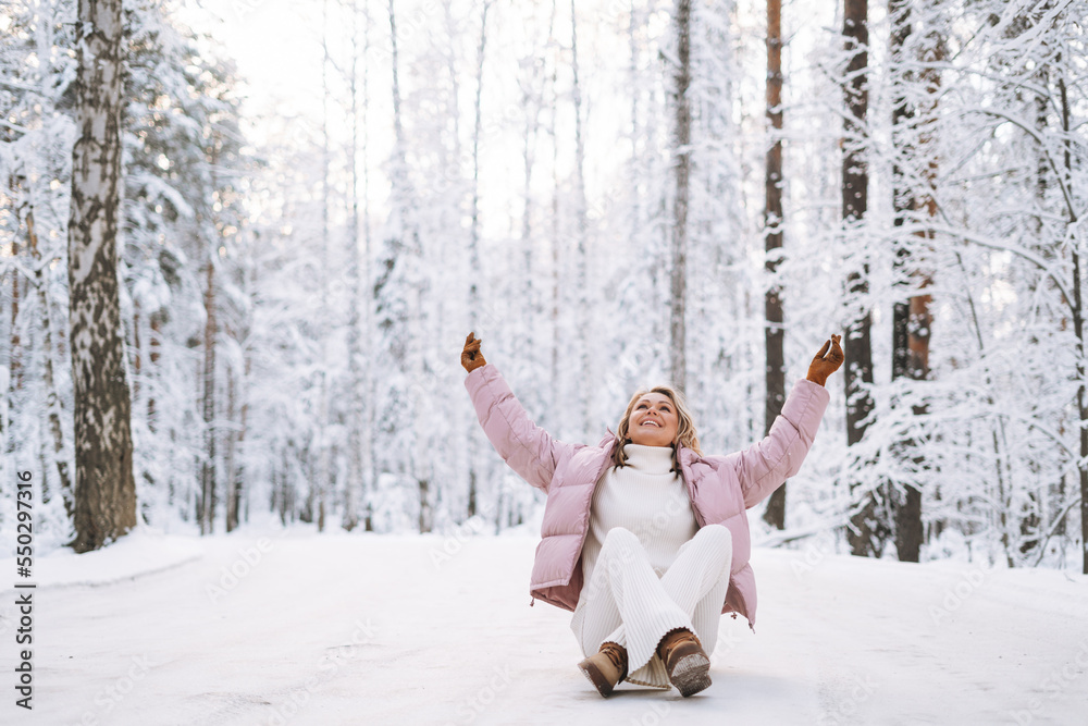 Young woman with blonde hair in winter clothes having fun sitting in snowy winter forest