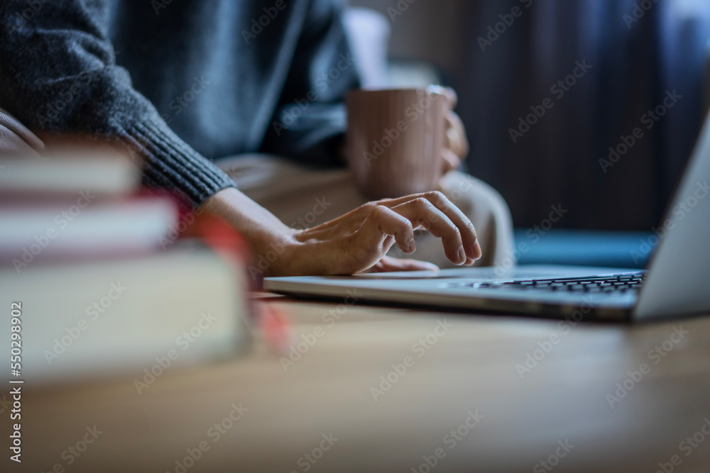 Closeup shot of a female hand working on a laptop using a touchpad. A woman in a warm sweater holds a mug of coffee