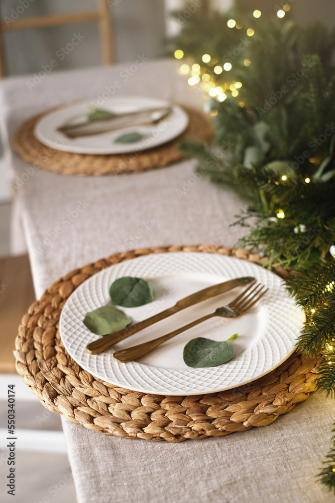 Decorated Christmas plate. Served Christmas table closeup. Holiday dinner preparation