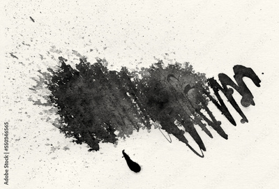 Black watercolor and ink blot drops on paper beige texture copy space bakground.