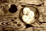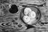 Handmade marshmallow. Natural sweetness. Apple zephir and cup of tea in wood surface
