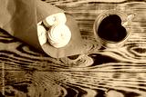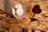 Handmade marshmallow. Natural sweetness. Apple zephir and cup of tea in wood surface