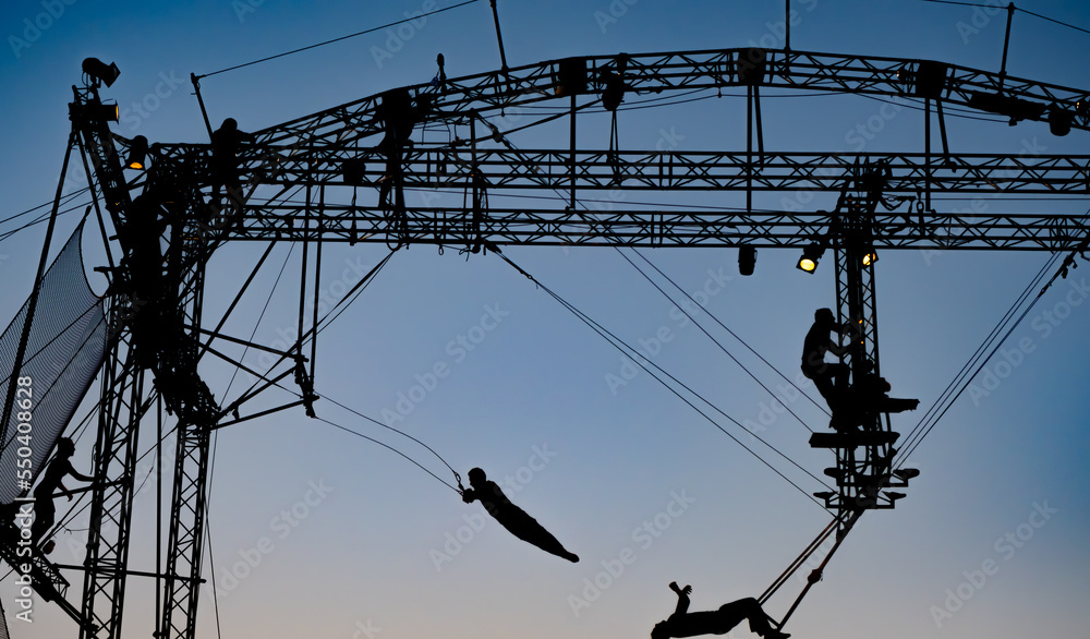 silhouettes of trapeze artists acrobats on the metal scaffolding at sunset