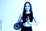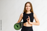 A young girl with a mat in her hands makes a gesture of greeting in yoga on a white background.