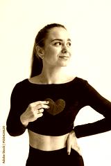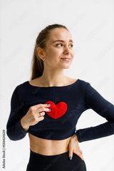 Caring for the heart, cardio training. A young woman takes care of health and holds a red heart in her hands.