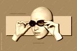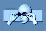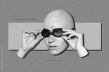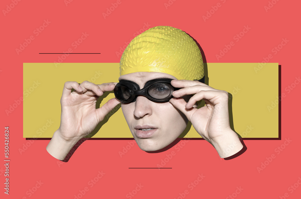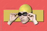 Mixed media collage with head of a young woman in swim glasses and yellow swim hat