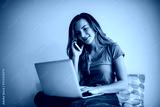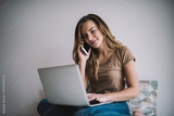 Caucasian hipster girl calling to friend for invite to evening movies searching video on popular website, millennial female freelancer checking laptop update during smartphone conversation via app
