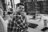Profile portrait of cheerful intelligent web designer person sit chair create project workplace open space indoors