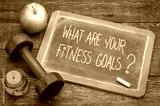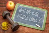 What are your fitness goals? White chalk text on a slate blackboard with a dumbbell, apple and tape measure. Goal setting and planning exercise activities.