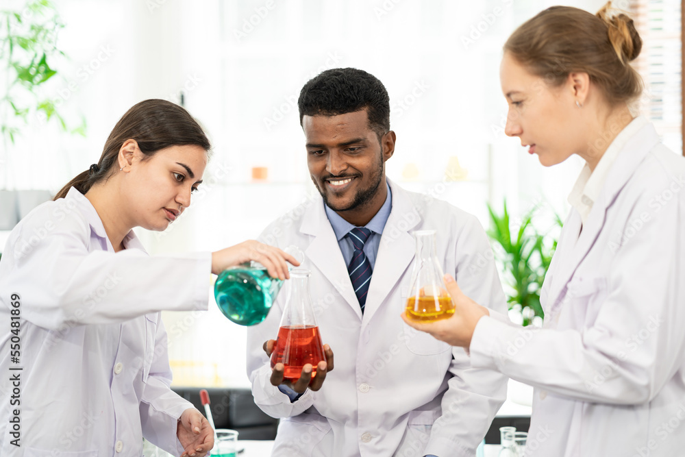 Portraits of a diversity of scientists smile in a research laboratory. Group of chemistry students working on hemp plant and Marijuana research in the lab. Concept of alternative herbal medicine, CBD