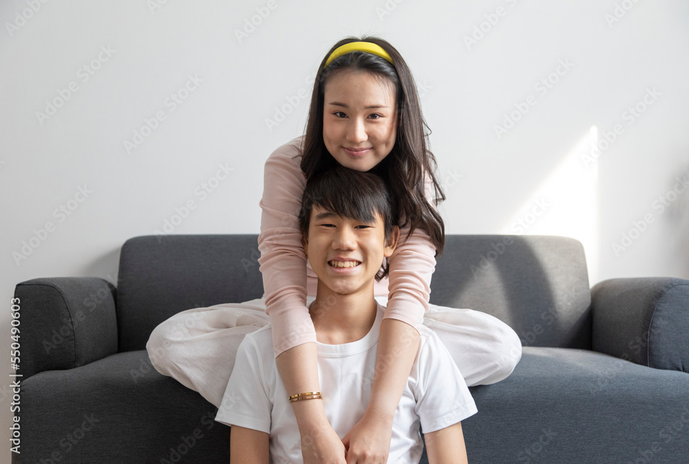 Laughing and hugging asian brother and sister with care and love on sofa at home.