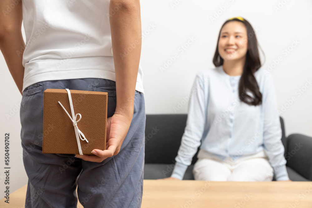 Young asian man hide a gift box with woman sitting on a sofa in living room relax and resting ,happy lover romantic couple concept.