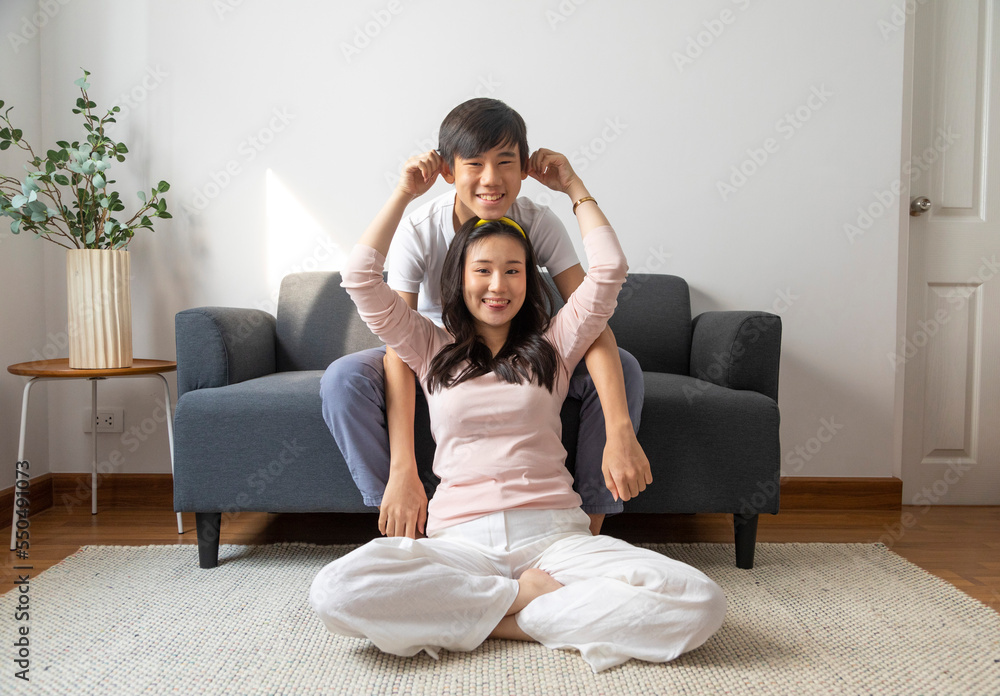 Asian brother and sister hugging with care and love sit on sofa at home.