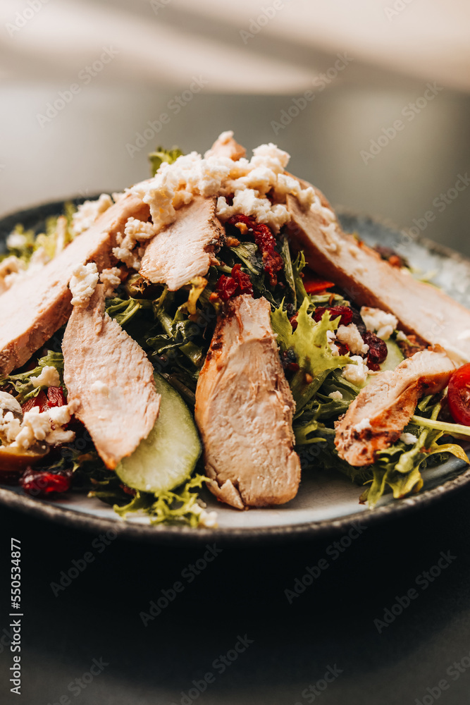 Salad with chicken pieces, cheese and lettuce. Healthy and delicious food