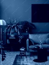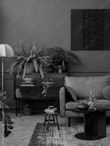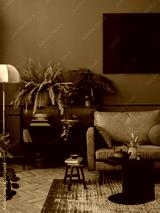 Interior design of living room interior with mock up poster frame, brown sofa, plants, glass sideboard, black coffee table, wooden floor, lamp and personal accessories. Home decor. Template.