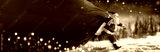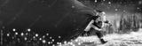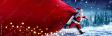 Santa Claus With Red Banner Bag Running On Snow In Winter Landscape - Fast Delivery Present