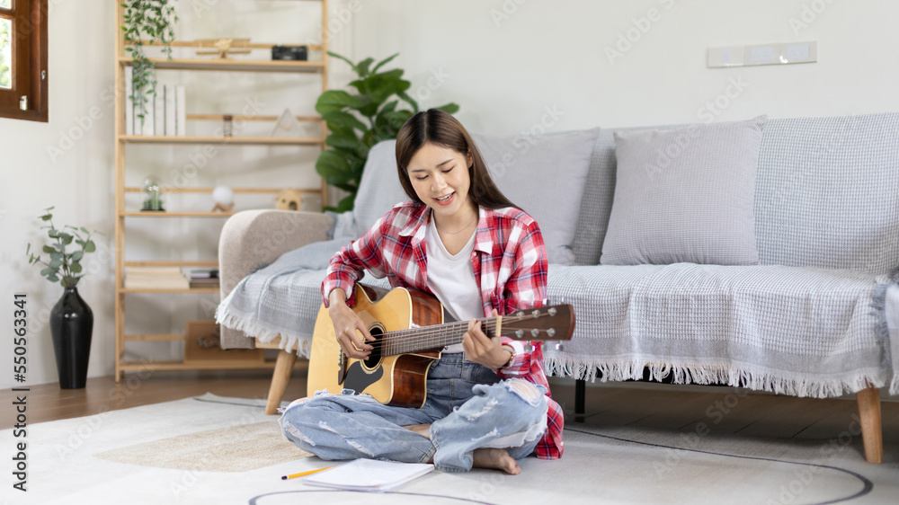 Woman practicing or learning to play guitar and practice using his fingers to hold guitar chords while looking at music notes with intention, Taking advantage of free time, Relax during free time.