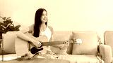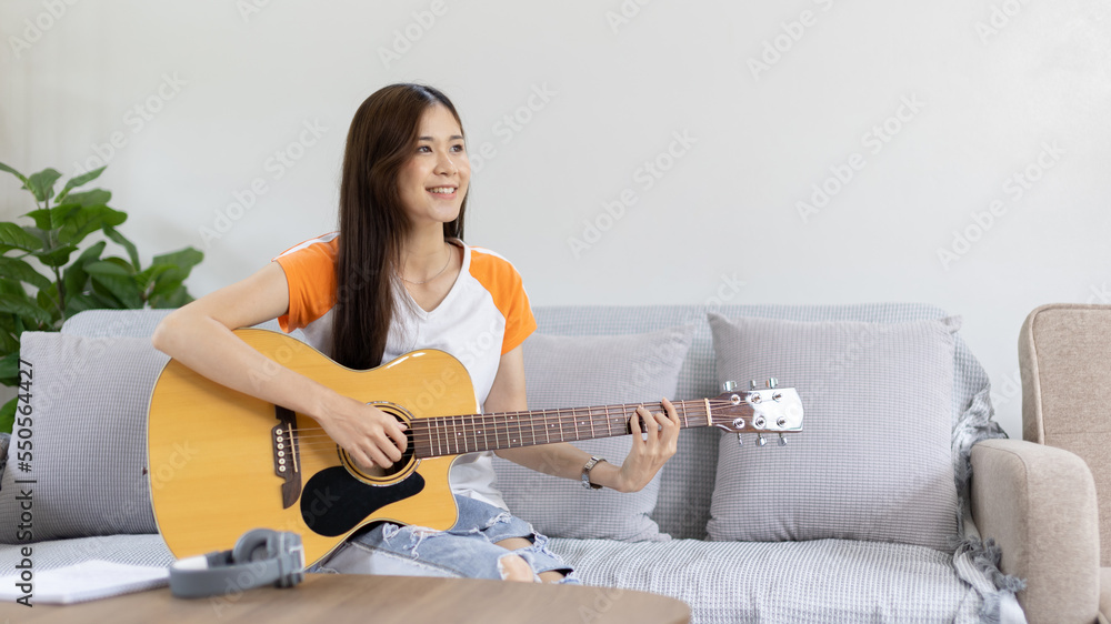Asian female artist playing the guitar and singing happily in the living room, Relaxation with music therapy, Spending free time with music, Joy of playing music, Acoustic guitar.