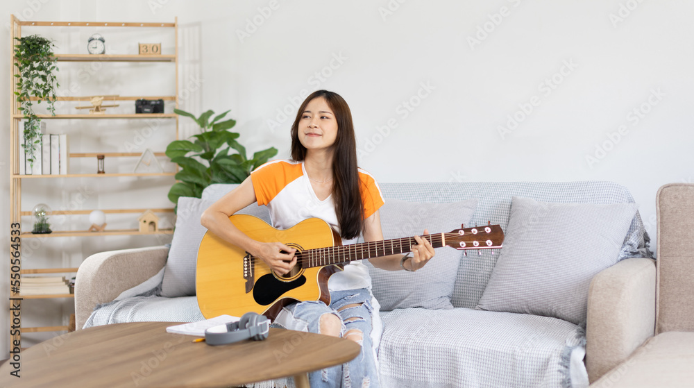 Asian female artist playing the guitar and singing happily in the living room, Relaxation with music therapy, Spending free time with music, Joy of playing music, Acoustic guitar.