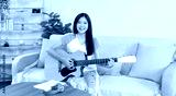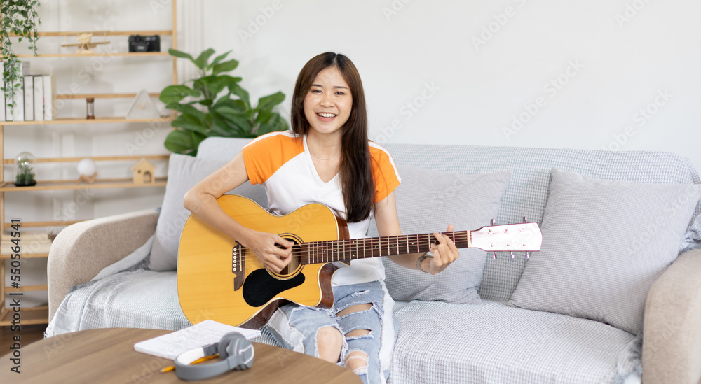 Asian female artist playing the guitar and singing happily in the living room, Relaxation with music therapy, Spending free time with music, Joy of playing music, Acoustic guitar.