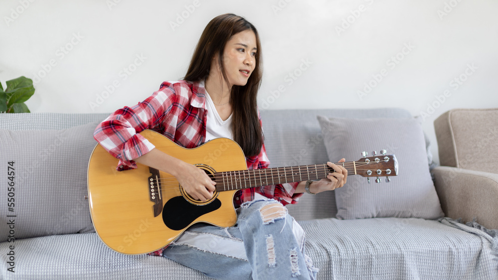 Asian female artist playing the guitar and singing happily in the living room, Relaxation with music therapy, Spending free time with music, Joy of playing music, Acoustic guitar.
