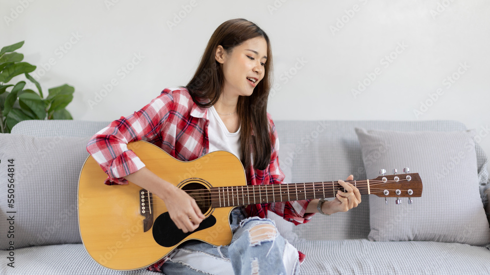 Asian female artist playing the guitar and singing happily in the living room, Relaxation with music therapy, Spending free time with music, Joy of playing music, Acoustic guitar.