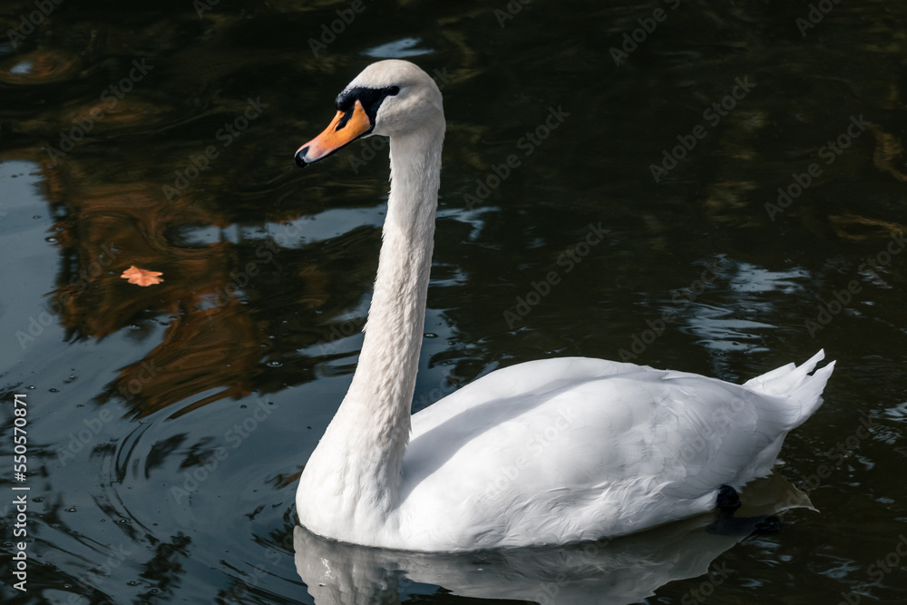 White swan, elegant large waterbird with a long flexible neck, sunny close-up on dark pond water with reflection and fallen leaf