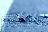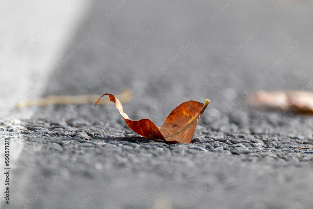 Autumn dry leaf macro on asphalt road. Fallen leaf on a walking path with blurred background. Autumn concept