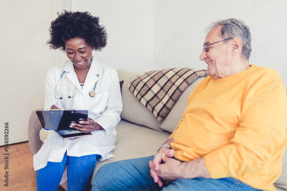 Nurse analyzing medical data during home visit. Happy female caretaker assisting elderly old grandfather man. Picture of smiling nurse assisting senior grandpa.