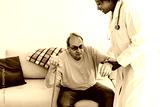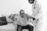 Home caregiver helping a senior man standing up at home. Shot of a caregiver assisting her senior patient at home.