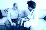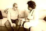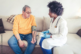 Elderly hypertension cardiovascular problems concept. Female nurse doing blood pressure measurement of a senior man patient. Doctor checking blood pressure of an elderly man at old age home.