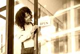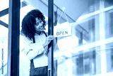 Happy waitress standing at restaurant entrance. Portrait of african american business woman attend new customers in her coffee shop. Happy woman owner showing open sign in her small business shop.