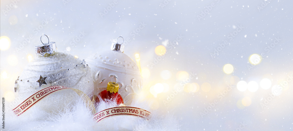 art Christmas greeting card or banner design; holidays party background with holidays decoration and christmas tree light