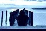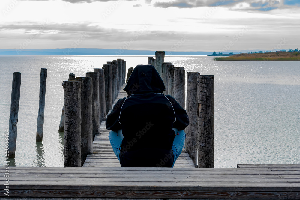A man in a jacket and hood is sitting against the background of a wooden bridge of a marine berth for ships with his back to the camera.