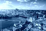 Prague scenic spring aerial view of the Prague Old Town pier architecture Charles Bridge over Vltava river in Prague, Czechia. Old Town of Prague with the Castle in the background, Czech Republic.