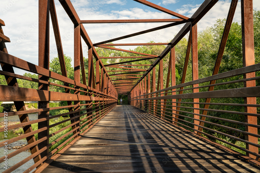 bike trail and a long footbridge over a river with distant cyclist - Poudre River Trail in Fort Collins, Colorado