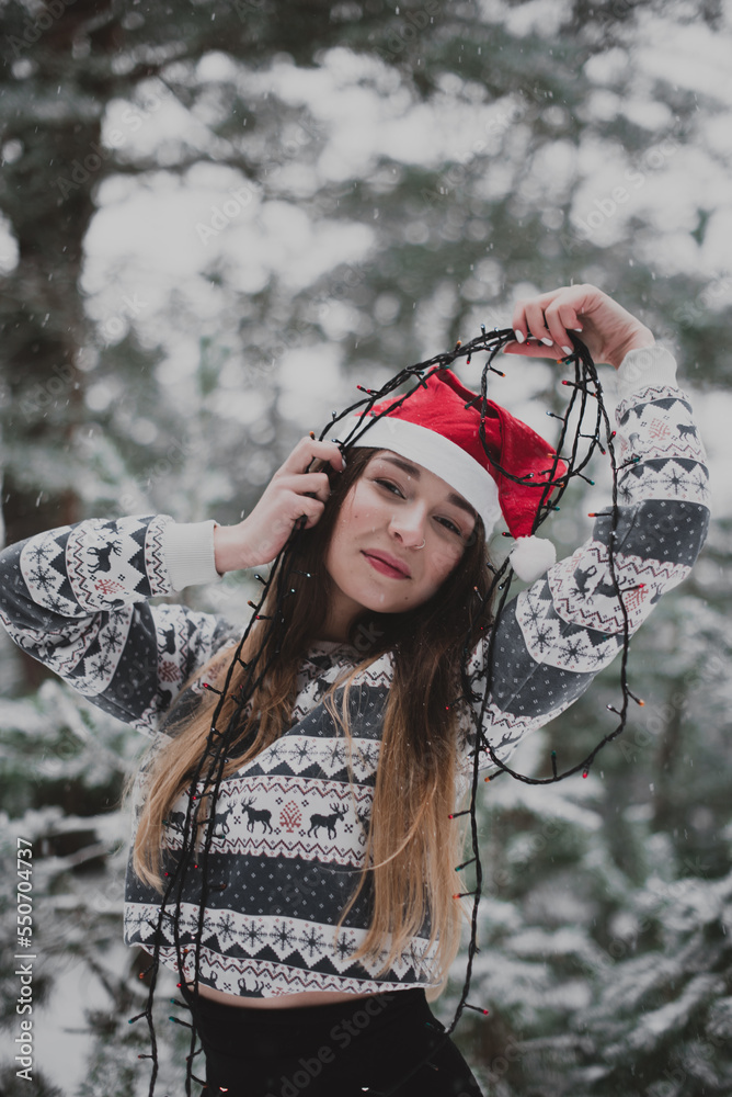 Winter portrait of young beautiful brunette woman wearing sweater. Snowing winter beauty fashion concept.