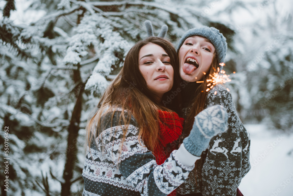 .Close up fashion portrait of two sisters hugs and having fun, holding sparklers in winter time forest, wearing sweaters and scarfs,best friends couple outdoors, snowy weather