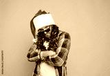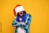 angry bearded man in a santa hat and sunglasses is sad on a yellow background.