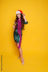 woman in green sparkly cocktail dress wearing santa hat holding pink boa and champagne glass