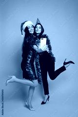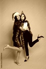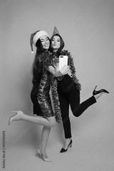 two young pretty women in sparkly cocktail dresses, party hat and santa hat smile and take selfie