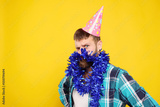 bearded man in a pink party cap with a blue boa on his beard grimaces on a yellow background