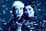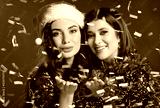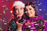 pretty young women in sparkling dresses, wearing a santa hat and with a boa are smiling, celebrating Christmas and sending an air kiss on the background of confetti.