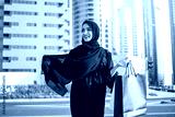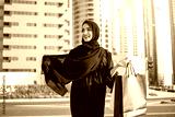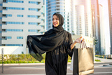 Young beautiful Arabic woman wearing abaya and holding a shopping bags while walking on street.