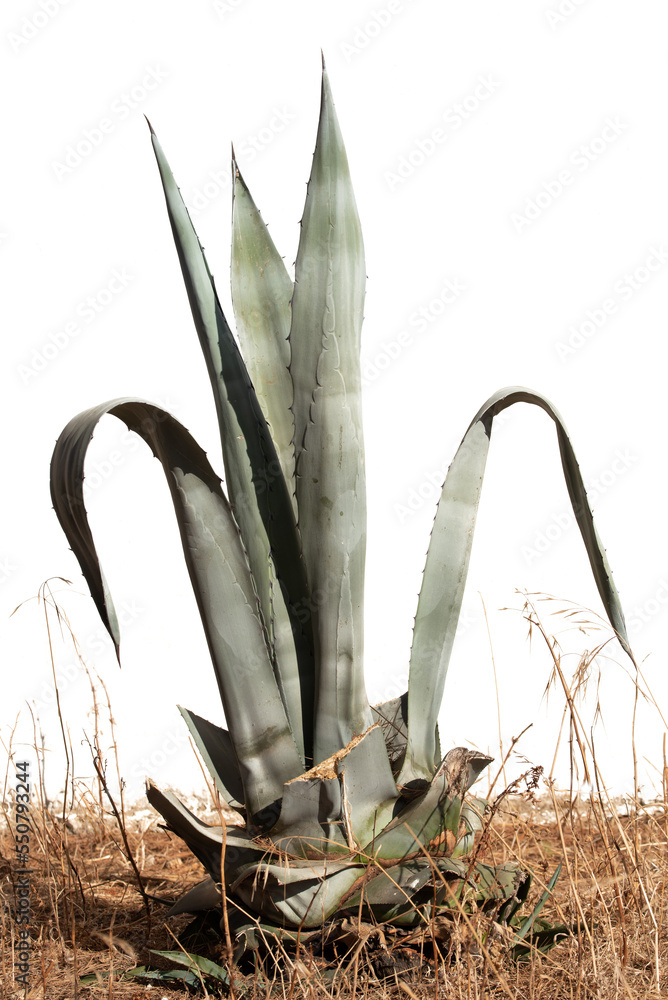 Close-up of a green agave. The plant grows on arid, dry soil in front of a white background and is isolated.
