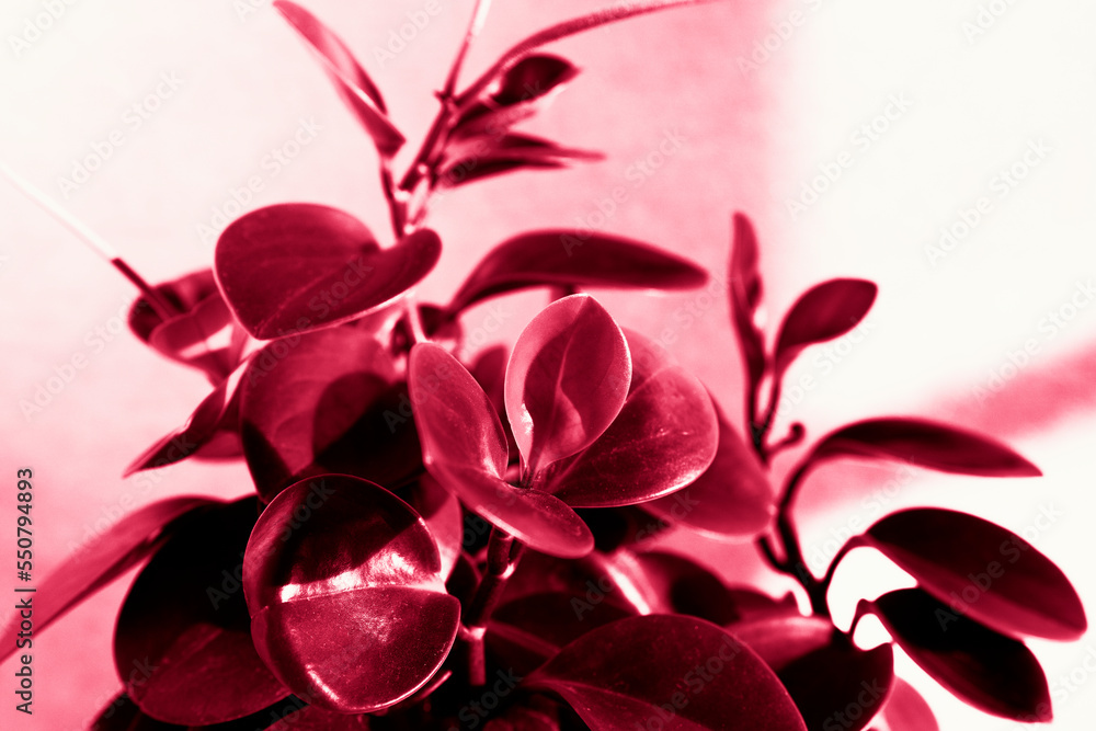 Plant with beautiful leaves in a pot indoors. Peperomia close-up in trendy color 2023.