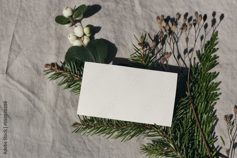 Blank textured business card mockup template. Christmas stationery, branding. Spruce, cypress tree and snowberry branch in sunlight. Beige linen tablecloth background. Selective focus. Top view.